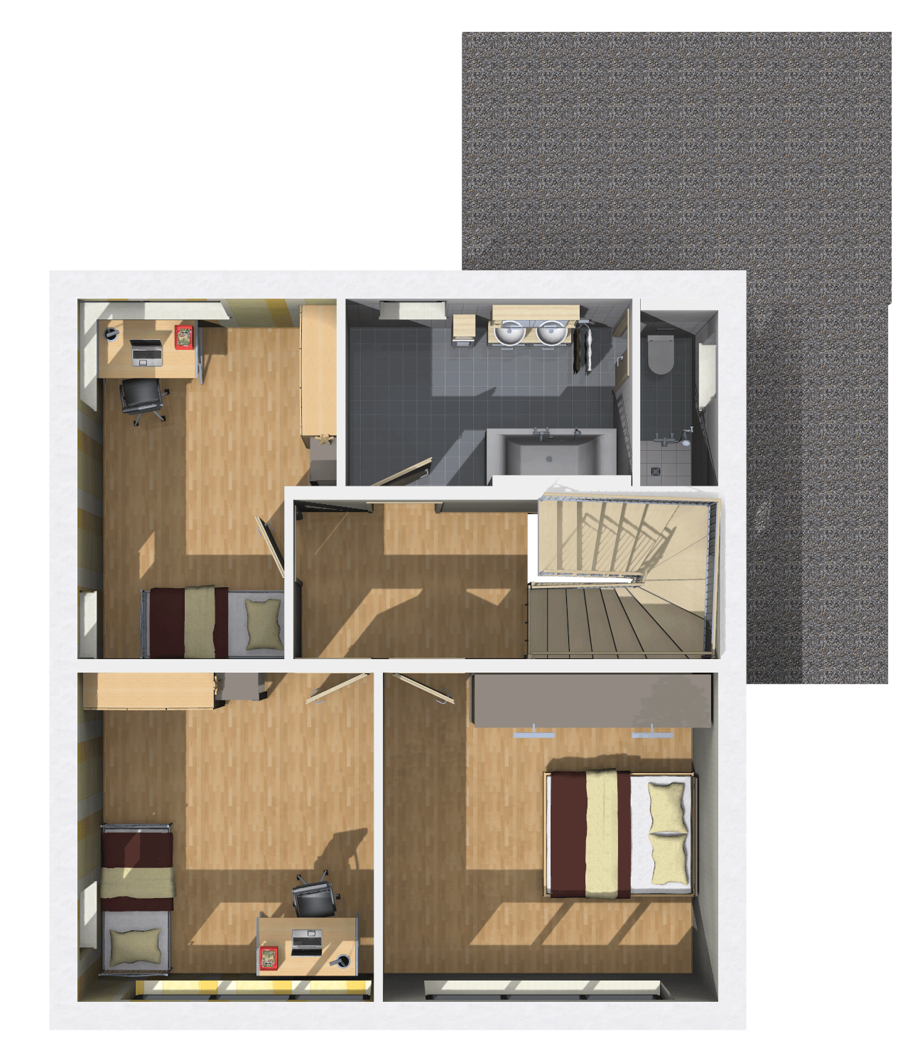 Bewährt und dazu praktisch und preiswert: Der unschlagbare Vorteil von Häusern mit Satteldach ist die Fülle an unterschiedlichen Dachneigungen und Traufhöhen. Dadurch lässt sich diese Dachform auf fast jedem Grundstück realisieren. Durch die Neigung des Daches bekommt das Haus seinen ganz eigenen Charakter. Ein Studio im Dachspitz bietet Ausbaureserven für Später, wenn z.B. größere Kinder hier ihr „Eigenes Reich“ bekommen. Das spart Geld während der Bauzeit.