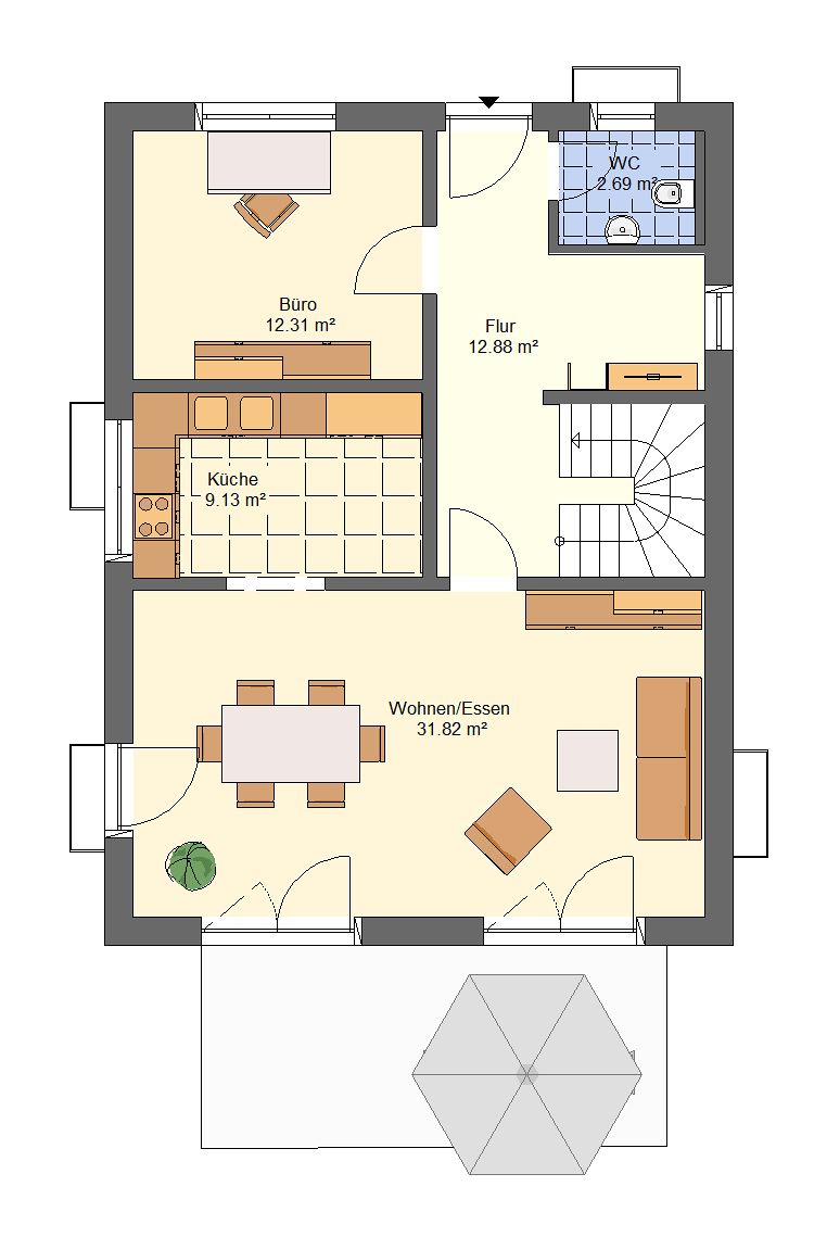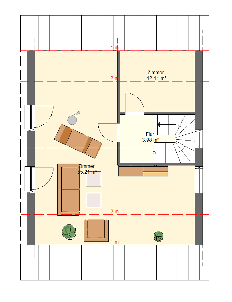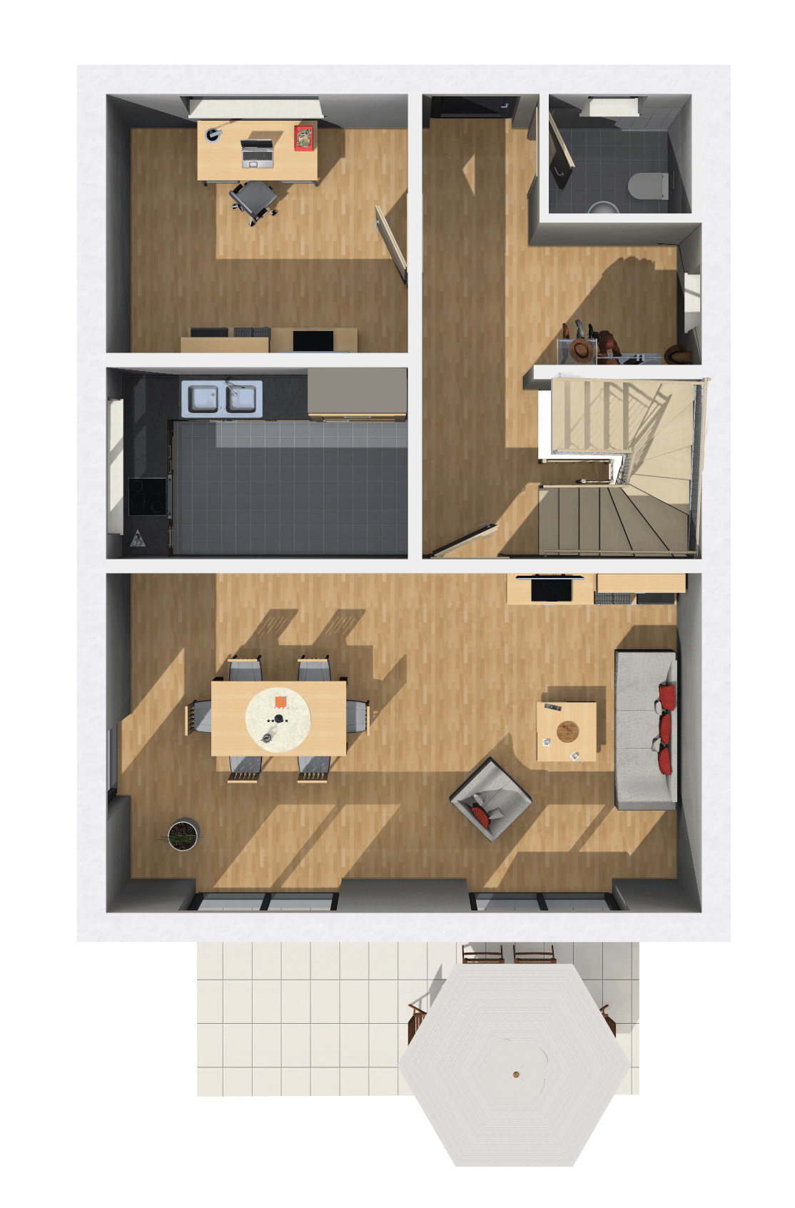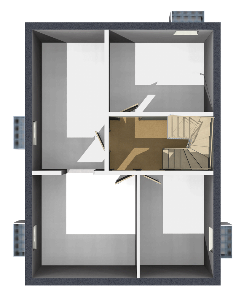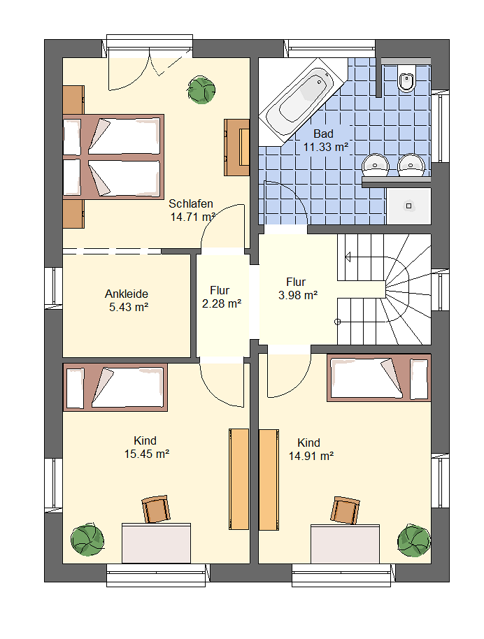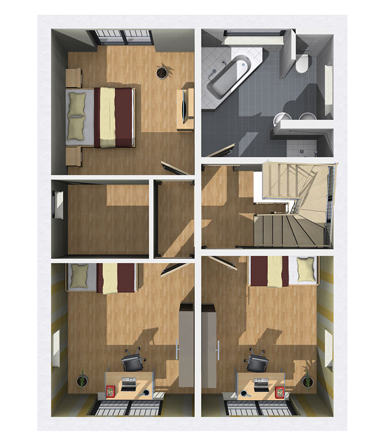 Bewährt und dazu praktisch und preiswert: Der unschlagbare Vorteil von Häusern mit Satteldach ist die Fülle an unterschiedlichen Dachneigungen und Traufhöhen. Dadurch lässt sich diese Dachform auf fast jedem Grundstück realisieren. Durch die Neigung des Daches bekommt das Haus seinen ganz eigenen Charakter. Ein Studio im Dachspitz bietet Ausbaureserven für Später, wenn z.B. größere Kinder hier ihr „Eigenes Reich“ bekommen. Das spart Geld während der Bauzeit.